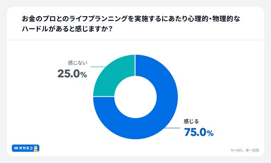 「お金のプロとのライフプランニングを実施するにあたり心理的・物理的なハードルがあると感じますか?」と質問したところ、「感じる」75.0%、「感じない」25.0%と、4人中3人がハードルを感じていることが分かりました。