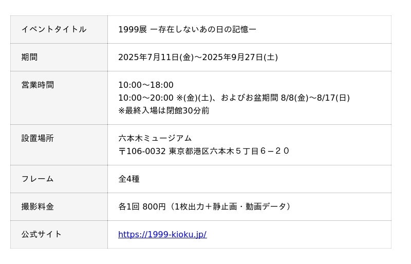 キタムラ・ホールディングス グループのピックハイブ株式会社(本社:東京都新宿区、代表取締役社長 兼 COO:大迫 由典)は、2025年7月11日(金)~2025年9月27日(土)の期間で、1999年前夜の不安と期待が交差する独特な空気を感じながら、予言されたあの『世界の終わり』を“終末の少女”の導きによってたどるホラー体験型展覧会「1999展 ー存在しないあの日の記憶ー」会場の六本木ミュージアムに、オリジナルフレームで撮影できるフォトブースを設置します。