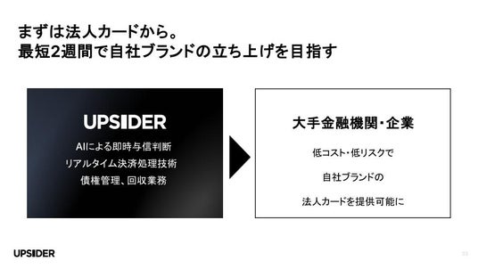 その第一弾として法人カードの与信システムの外部提供を開始します。さらに今後は、UPSIDER AI経理、UPSIDER BLUE DREAM Fundなどで培った技術についても、会計事務所や金融機関など人手不足に悩む業界への技術提供を拡大していく予定です。
