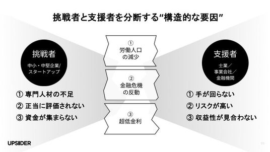 この断絶の背景には、労働人口の減少、長く続いた低金利、金融危機による反動といったマクロ環境の要因があります。挑戦者側では経理人材不足や月次決算の遅れ、財務情報の不足による信用証明の困難さが課題となっている一方、支援者側でも人手不足やリスクの高さ、収益性の課題が支援を阻害しています。