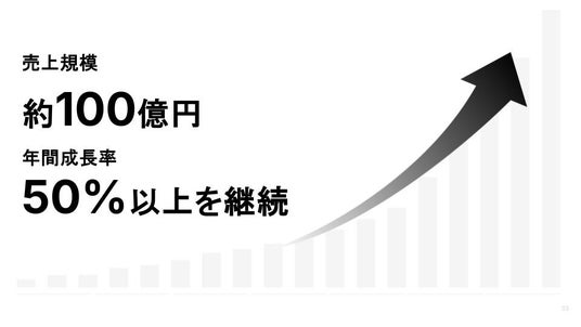 これまでの事業実績についてもご報告いたしました。当社のユーザー数は8万社以上(2025年3月末時点)に拡大し、当初のスタートアップ中心から中小企業へと顧客基盤が大きく広がっています。売上規模は創業から7年で年間約100億円規模に到達し、年間成長率50%以上という高い成長を維持しています。
