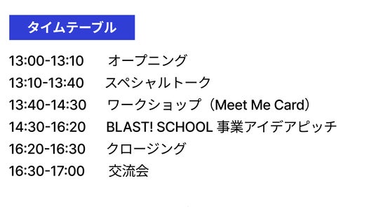 BLAST! SCHOOLはこれまでに個別伴走にて150名を超える「起業家精神」を持った高校生を輩出し、探究・課外活動・ビジネスに挑戦する高校生の成長を支援してきました。本イベントは、「これから挑戦を始めたい」高校生から、「さらに一歩踏み出したい」経験者まで、すべての学生が刺激と学びを得られる場として企画されています。