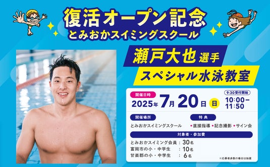 水泳教育を手がけるSwimmy株式会社(本社:東京都、代表取締役:菅原優)は、運営する「とみおかスイミングスクール(群馬県富岡市)」にて、2016年リオデジャネイロオリンピック銅メダリストの「瀬戸大也」選手による特別水泳教室を7月20日(日)に開催いたします。オリンピックメダリストによる子ども対象の水泳教室は群馬県内では今回が初の開催となります。