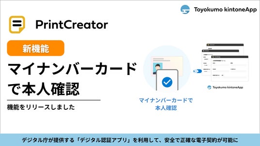 「すべての人を非効率な仕事から解放する」をミッションに掲げ、ビジネス向けのクラウドサービスを提供するトヨクモ株式会社(本社:東京都品川区、代表取締役社長:山本 裕次、以下トヨクモ)は、サイボウズ株式会社(本社:東京都中央区、社長:青野 慶久、以下サイボウズ)が提供する業務改善プラットフォームである「kintone」と連携するPrintCreatorにおいて、「マイナンバーカードで本人確認」の機能をプロフェッショナルコースにて提供開始したことをお知らせいたします。