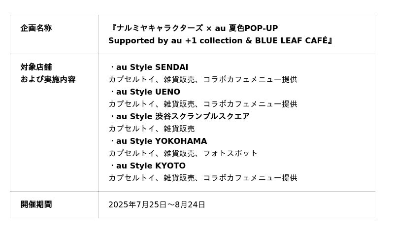 株式会社ナルミヤ・インターナショナル(本社:東京都港区、代表取締役執行役員社長:國京紘宇)は、KDDI株式会社(本社:東京都港区、代表取締役社長 CEO:松田 浩路)の運営する全国5都市(仙台、上野、渋谷、横浜、京都)のKDDI直営店にて、2025年7月25日から8月24日の期間、当社が展開するジュニアアパレルブランドのキャラクター『ナルミヤキャラクターズ』のポップアップイベント(以下、本イベント)を開催します。