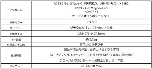 ・「GeForce RTX(TM) 5070 Laptop GPU」を搭載し、ハンティングアクションゲームを高フレームレートでプレイするために必要なゲーミング性能を提供