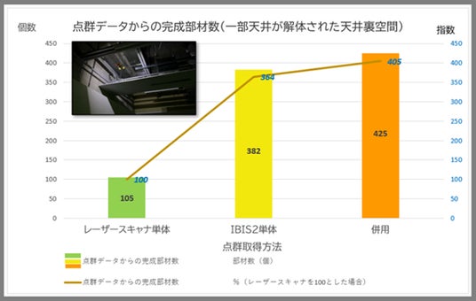 従来の3Dスキャン手法と比べ、機械室などの天井の無い大空間にある設備を含めた部材の3Dモデル化は完成部材数が約135%向上、一部天井が解体された天井裏空間にある設備を含めた部材の3Dモデル化は完成部材数が約400%向上し、スキャナ、ドローンそれぞれのメリットをお互いに補う形で、完成部材を増やすことに成功しました。