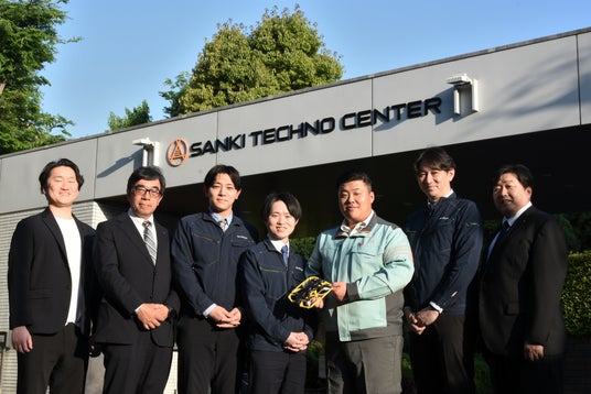 右から、三機工業株式会社建設設備事業本部技術管理本部BIM推進センター 石丸直BIM推進部長、有限会社キャド・ケンドロ 高橋和之課長、三機工業株式会社 副島卓哉氏、有限会社キャド・ケンドロ 栃澤幸成氏、及川直樹氏、三機工業株式会社 北岡基信専門部長、株式会社Liberaware 執行役員 全 貴成