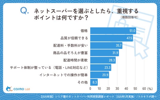 「価格」(51.0%)と「品質が信頼できる」(47.5%)が上位を占め、「配達料・手数料が安い」(35.7%)や、「商品の品ぞろえが豊富」(31.9%)、「配達時間が柔軟」(28.3%)が続きます。価格と品質の両立を求める姿勢が顕著で、コストパフォーマンスへの強い意識が見て取れます。