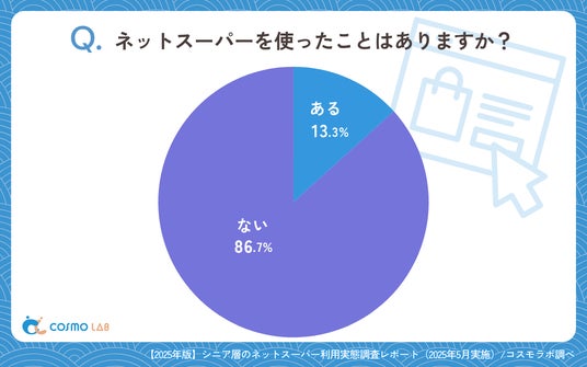 「ない」(86.7%)が圧倒的多数を占め、「ある」(13.3%)は少数にとどまっています。シニア層におけるネットスーパーの利用経験率は極めて低いという現実が浮き彫りになりました。
