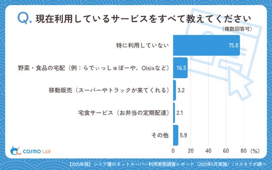「特に利用していない」(75.8%)が圧倒的多数で、「野菜・食品の宅配」(16.5%)や、「移動販売」(3.2%)、「宅食サービス」(2.1%)と続きます。食材配送や移動販売といった代替サービスの利用率が極めて低く、シニア層における宅配系サービスの浸透が不十分な状況が明らかです。