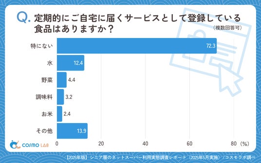「特にない」(72.3%)が圧倒的多数を占め、定期配送サービスの利用者は少数派にとどまっています。「水」(12.4%)や、「野菜」(4.4%)、「調味料」(3.2%)といった日常消費品で一部利用が見られるものの、定期購入という形式は一般的な選択肢となっていません。