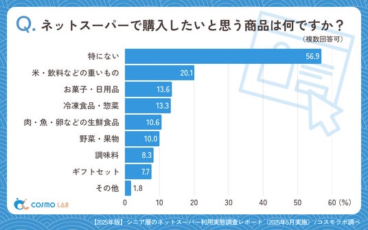「特にない」(56.9%)が最多で、「米・飲料などの重いもの」(20.1%)や、「お菓子・日用品」(13.6%)、「冷凍食品・惣菜」(13.3%)への一定の需要が確認できます。「肉・魚・卵などの生鮮食品」(10.6%)は低調で、鮮度への不安が影響していると推察されます。