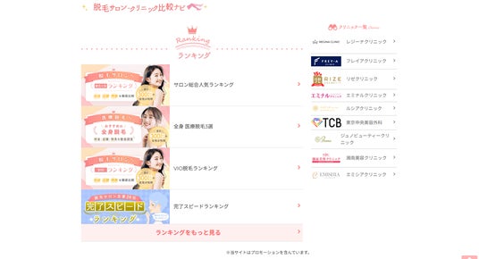 - 脱毛クリニック比較ナビ(女性向け)業界最大級の脱毛サロン・医療脱毛クリニックの比較サイト。500人以上のリアルな口コミでランキングを作成し、お得な脱毛サロン、医療脱毛クリニックが一目でわかる。エステ脱毛だけでなく、医療脱毛の情報も満載。