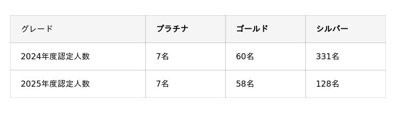 プラチナ、ゴールド、シルバーの3種のグレードに分かれ、「接客ロールプレイングコンテストでの入賞経験」、「お客様からお褒めの言葉をいただいた実績」などグレード毎に設けられた条件をクリアしたスタッフだけに与えられる称号です。認定者には、認定バッジ、賞状、報奨を授与します。