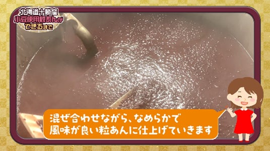 北海道十勝産小豆のおいしさについて、寒暖差で糖分が多い点などを説明し、選別から仕上げの「本炊き」まで手間暇かけて粒あんを作る工程を解説しています。