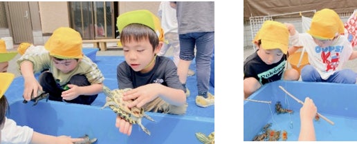 そこで、当社では“保育の可能性を広げることで、豊かな社会づくりを担う”という理念のもと、運営する保育所に通う家庭のみならず、地域の子育て家庭への育児支援を積極的に行っています。今回はスターチャイルド梶ヶ谷ナーサリーにて「移動水族館」を開催いたしました。地域一体となり子育てをサポートするため、今後も各園にて地域の子育て支援を進めてまいります。
