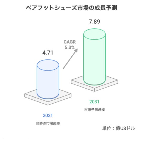 この価値観の変化はフットウェア市場にも大きな影響を与えており、足の健康を支える「ベアフットシューズ」の市場は、Allied Market Researchのレポートによれば、2021年の4億7,100万米ドルから、2031年には7億8,900万米ドル規模へ成長すると予測されています(年間平均成長率 5.3%)。※
