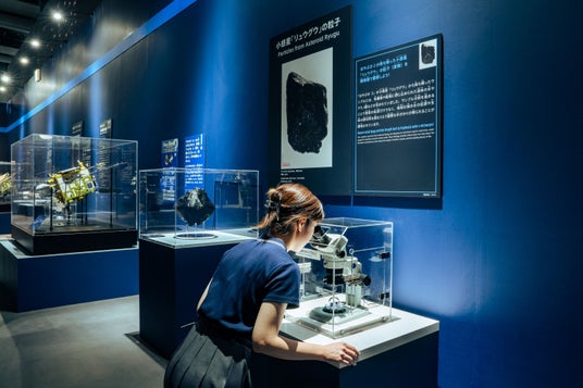 太陽系の起源を解明する重要な粒子(実物)を顕微鏡で観察できます。さまざまな困難を経て地球に持ち帰られた、日本の宇宙探査技術の結晶です。