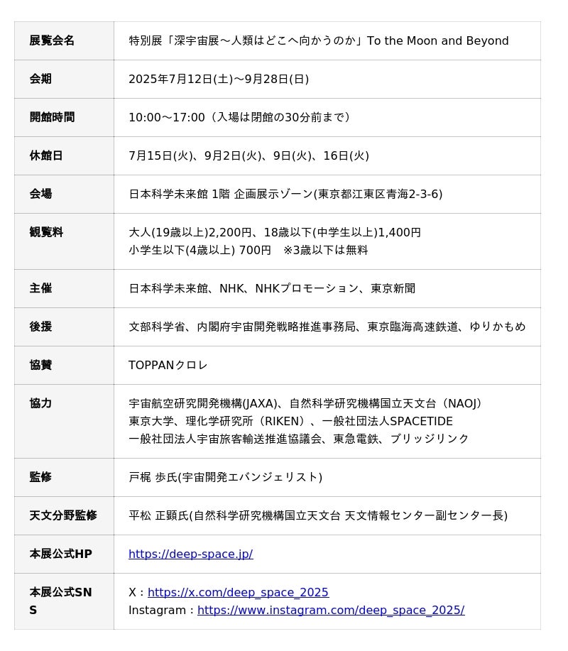 日本科学未来館(略称:未来館 館長:浅川智恵子)とNHK、NHKプロモーション、東京新聞が主催する、特別展「深宇宙展~人類はどこへ向かうのか」To the Moon and Beyondが、2025年7月12日(土)に開幕します。