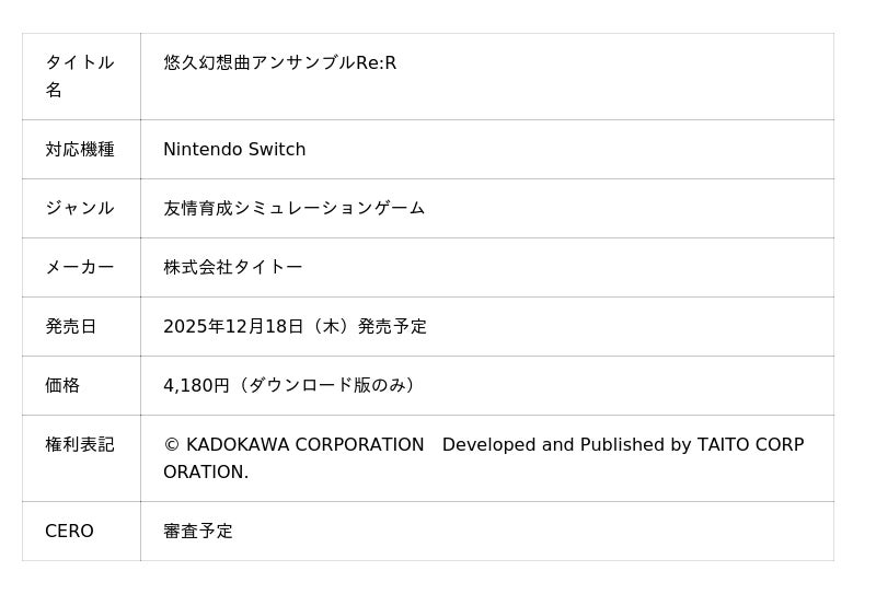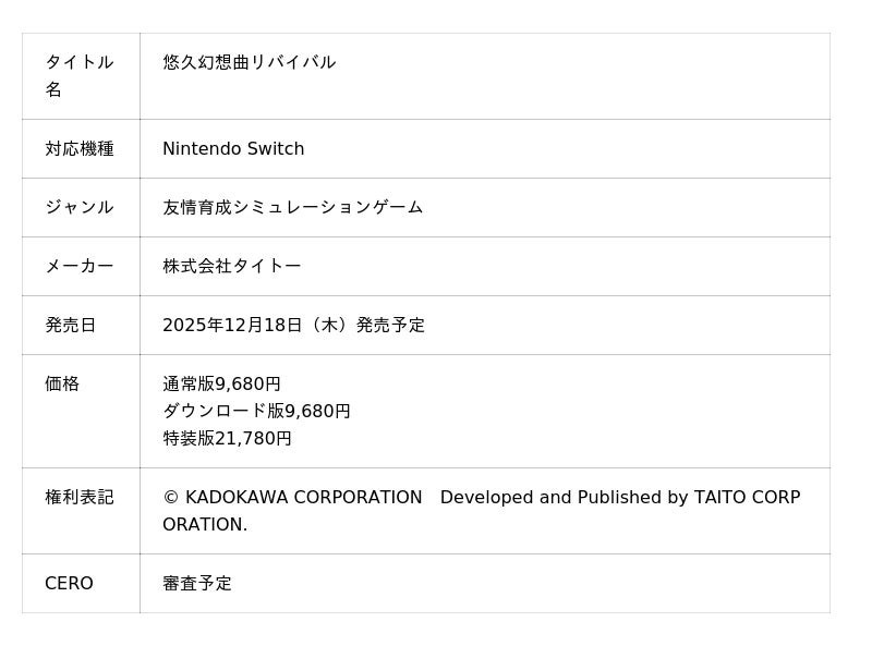 株式会社タイトー(本社:東京都新宿区、以下タイトー)は、12月18日(木)発売予定のNintendo Switch(TM)用ソフト『悠久幻想曲リバイバル』について、オリジナル版の主題歌も担当した畑亜貴氏による、新規書き下ろし楽曲が主題歌となることを発表しました。本日、主題歌を使用したPVも公開いたします。