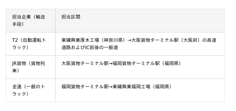 今回、「モーダルコンビネーション」の実証として初めて「往復」の区間を設定し、往路は、東罐興業の厚木工場(神奈川県)から大阪府までをT2の自動運転トラックで幹線輸送し、大阪府から福岡県までをJR貨物の貨物列車で輸送します。復路は、福岡県から大阪府までを貨物列車で輸送し、大阪府から東罐ロジテックの北関東営業所(埼玉県)までを自動運転トラックで輸送します。全通は、貨物駅と顧客の拠点間の集貨・配達を担当します。
