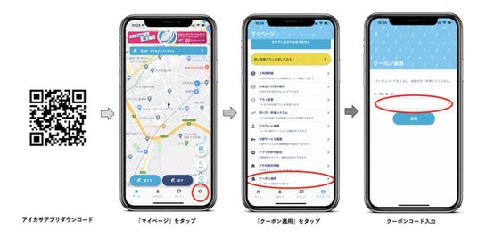 アイカサアプリをダウンロードし,「マイページ」の「クーポン適用」ページに取得したクーポンコードを入力するとクーポンが適応されます。