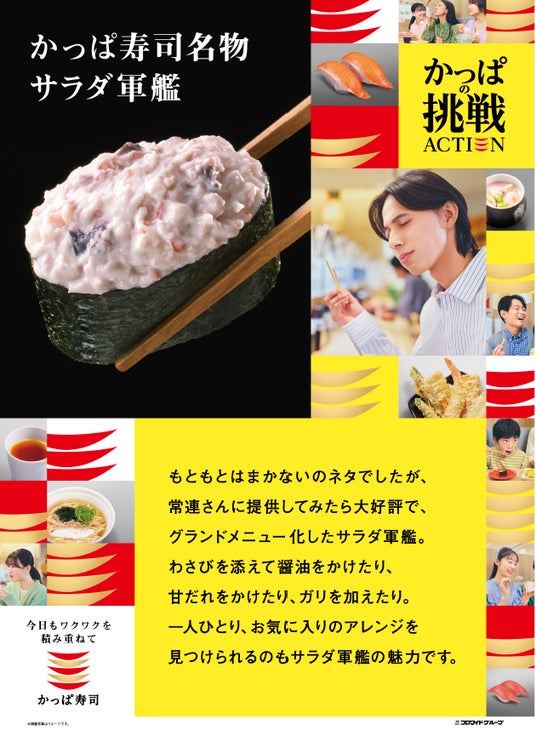 お客様に支持され続ける「おいしさ」と、積み重なった皿を眺めることで生まれる「楽しさ」を追求しながら、回転寿司の枠を超えた新たな価値の提供を目指しており、この想いは、創業以来変わることなく、今もなお進化し続けています。そんなかっぱ寿司の、お客様とともに歩む、飽くなき「ワクワク」とこだわりへの挑戦を、わかりやすく、親しみやすく紐解いてお伝えするのが「かっぱの挑戦ACTION」です。