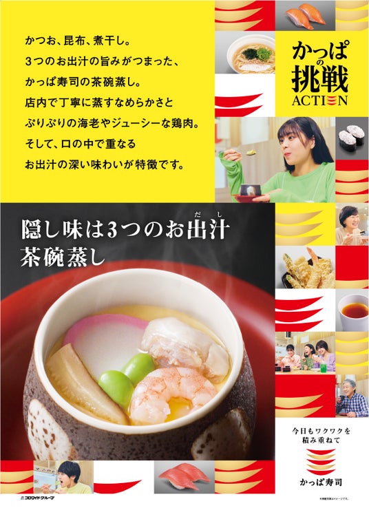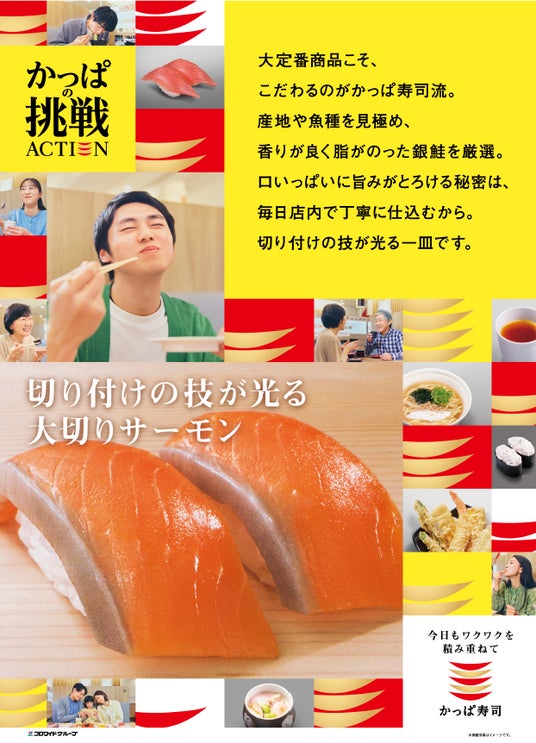コロワイドグループのかっぱ寿司(カッパ・クリエイト(株) 本社:神奈川県横浜市、代表取締役社長:山角豪)は、2025 年7 月16 日(水)より、かっぱ寿司の飽くなき「ワクワク」とこだわりへの挑戦を、わかりやすく、親しみやすく紐解いてお伝えする「かっぱの挑戦 ACTION」第二弾TVCM として「大切りまぐろ・大切りサーモン・茶碗蒸し・サラダ軍艦篇」を放映いたします。ナレーションには人気声優の下野紘さんを起用し、かっぱ寿司の“定番商品に込めたこだわり”を真摯に伝えます。