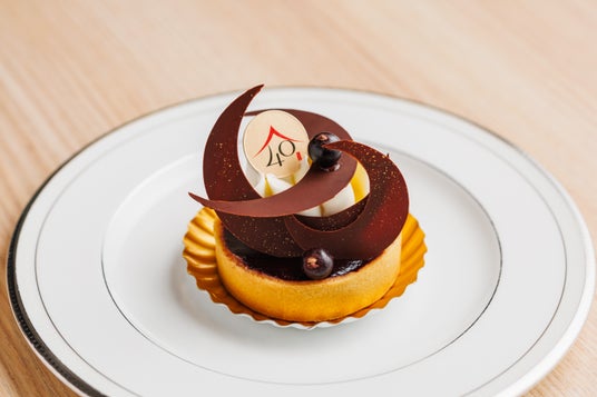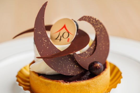 サクサクとしたタルト生地に、ふんわりと軽いチョコレート生地を重ね、甘酸っぱいカシスソースを流し込みました。上面にはなめらかなバニラクリームを絞り、チョコレートで繊細なデコレーションを施しています。