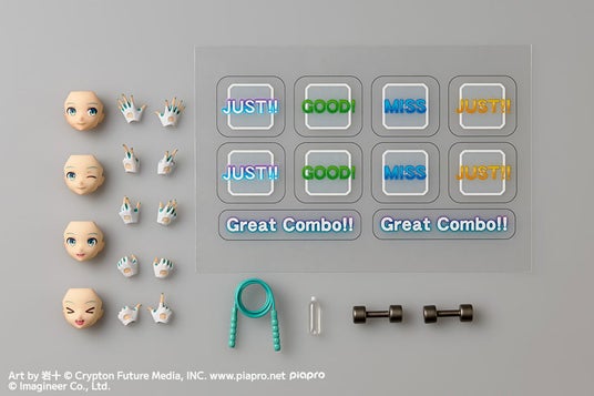 「Fit Boxing feat. 初音ミク」のゲーム本編から画面上を流れるアイコンやコンボ表示が、専用ベースに取り付けられるエフェクトシートとして付属し、ボクシングエクササイズシーンを演出。また、ダンベルや縄跳び、ペットボトルも付属するので、いろいろなトレーニングに励む様子も!!