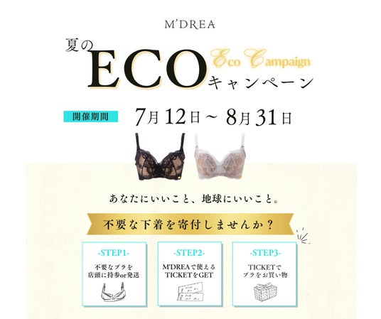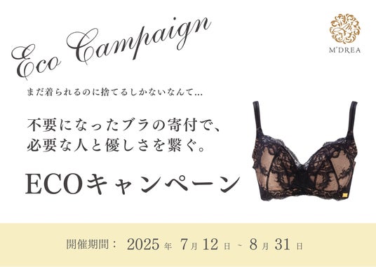 M’DREAが開催する「ECOキャンペーン」では、不要になったブラを寄付することで、必要としている方への支援とリユースを推進。画像はキャンペーン告知ビジュアル(2025年7月12日~8月31日開催)。