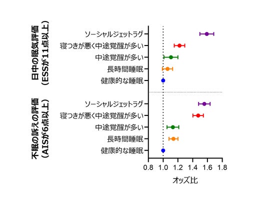 「健康的な睡眠」群と比較して、他のグループすべてで、不眠の訴えの評価が高い結果となりました。最も高かったのは「ソーシャルジェットラグ」群で、次いで「寝付きが悪く中途覚醒が多い」群でした。日中の眠気評価についても、「長時間睡眠」群を除く、グループで同様の傾向が見られ、やはり「ソーシャルジェットラグ」群がもっとも悪い結果を示しました。