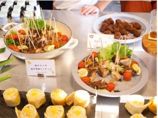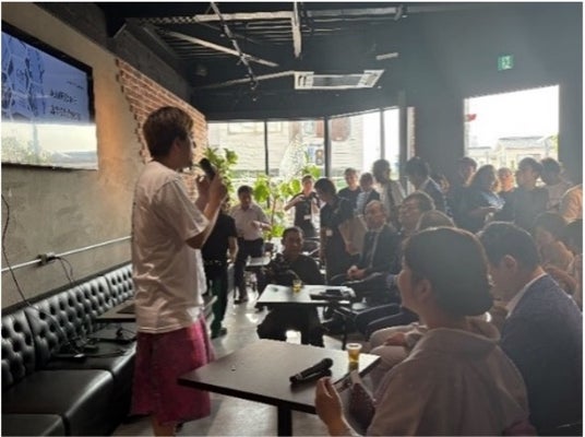 (写真下段左から)JUJIRO BLDで開かれた交流会では、施設代表の山口さんや地域で活動する方々が、それぞれの思いや取り組みを発表/交流会会場には、鹿島・太良の食材を使ったピンチョスが並び、参加者にふるまわれました