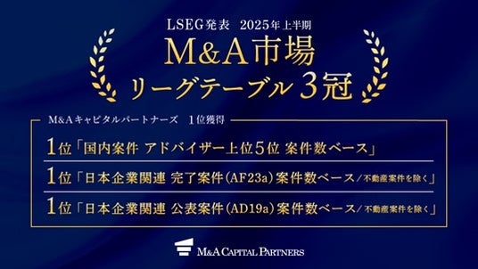 M&Aキャピタルパートナーズ株式会社(東京都中央区・代表取締役社長 中村悟、以降「MACP」)は、LSEG(ロンドン証券取引所グループ)データによるM&A市場リーグテーブル「日本M&Aレビュー 2025年上半期 フィナンシャル・アドバイザー」において、2024年に続き案件数ベース3部門で1位を獲得し、3冠を達成したことをお知らせいたします。