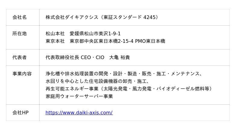 ダイキアクシスグループは、「水」を中心とした環境ソリューションを提供し、浄化槽をはじめとする家庭用・産業用の排水処理、住宅設備の販売施工、再生可能エネルギー事業、さらに家庭向けの飲料水サービスまで、持続可能な社会の実現に向けた多角的な事業を展開しています。排水処理事業は国内だけでなく海外にも事業を広げており、インドネシア、インド、スリランカに自社工場を構えてグローバルなニーズにも対応しています。