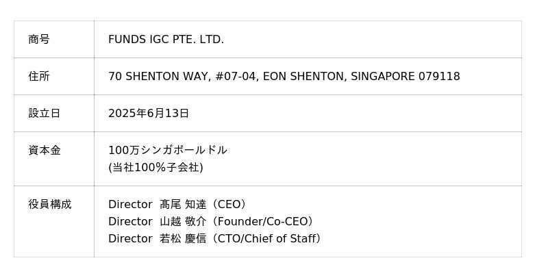固定利回り投資のオンラインプラットフォーム「Funds(ファンズ)」を運営するファンズ株式会社(本社:東京都渋谷区、代表取締役CEO:藤田雄一郎、以下 当社)は、2025年6月13日付で、海外事業統括拠点としてシンガポールにFUNDS IGC PTE. LTD.(以下 FIGC:フィグシー)を設立したことをお知らせします。