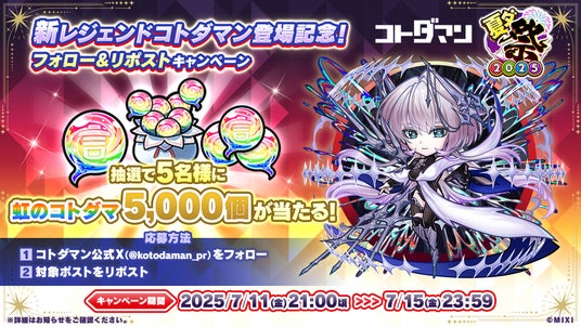 株式会社MIXI(東京都渋谷区、代表取締役社長 上級執行役員 CEO:木村 弘毅)が運営するスマホアプリのことばで闘う新感覚RPG「共闘ことばRPG コトダマン」(以下コトダマン)は、コトダマン夏の大型イベント「夏ダ祭2025」を2025年7月12日(土)より開催します。また、「コトダマンアワード2024」のレジェンド化人気投票で第1位に輝いた「ヨサリ」が、「レジェンドフェス召喚」に登場。イベントに先駆けて7月11日(金)より実施します。