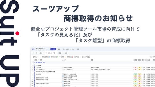 チームのタスク管理・プロジェクト管理ツール「スーツアップ」、商標取得(タスクの見える化及びタスク雛型)のお知らせ