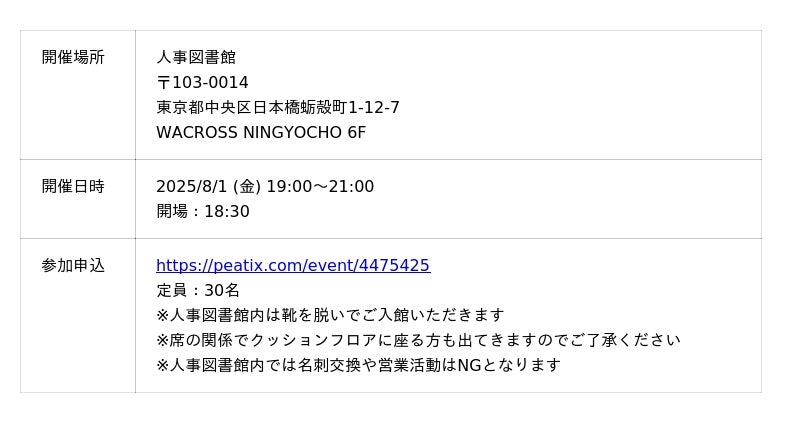 2024年4月1日に東京人形町にオープンした、人事関連職が集まるコワーキング×コミュニティ。2500冊以上の人事に関する書籍と600名以上の会員を有しており「仲間と学びで、未来を拓く」をタグラインに運営しています。
