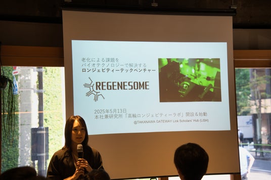スペースシードホールディングスは、プレゼンテーションにおいて 「老化による課題をバイオテクノロジーで解決する」 というミッションのもと開発した SAISEI リジェネソームサプリメント を紹介。