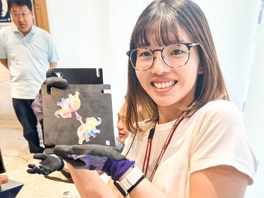 参加者の笑顔が生まれる瞬間。完成したキーホルダーを手にして喜ぶスタッフたち