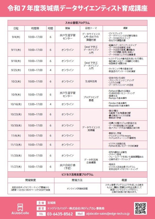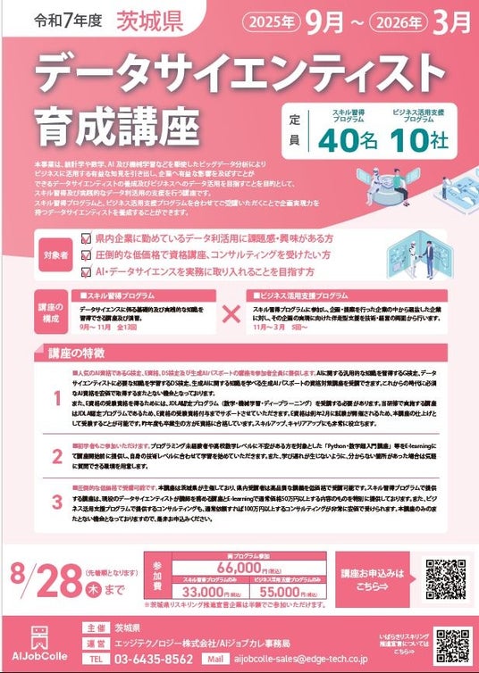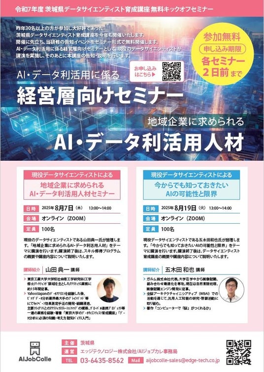 エッジテクノロジー株式会社は茨城県の委託を受け、データサイエンティストの養成およびビジネスへのデータ活用を目指す「令和7年度茨城県データサイエンティスト育成講座」を開催します。