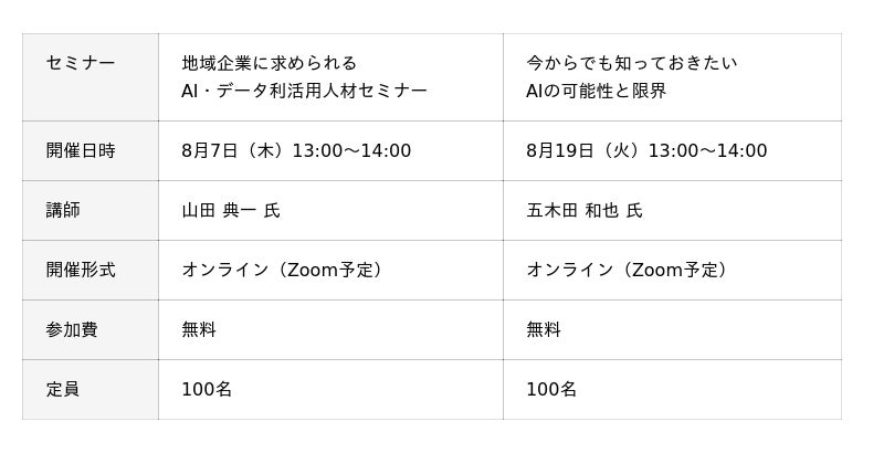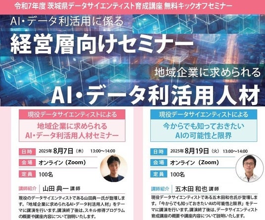 また、これに先立ち、茨城県内の企業にお勤めの方・個人事業主の方および個人の方を対象に「地域企業に求められるAI・データ利活用人材セミナー」(山田 典一氏)と「今からでも知っておきたいAIの可能性と限界」(五木田 和也氏)と題した2つのオンラインセミナーを無料でご提供します。
