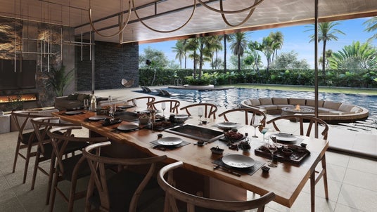 プール越しに爽やかな風と豊かな緑を感じながらBBQを堪能できるリビングダイニング