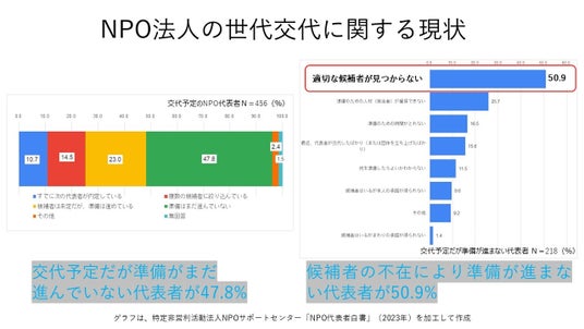 特定非営利活動法人NPOサポートセンターが2023年に行った調査では、400以上のNPOで世代交代を想定しているにもかかわらず、その約半数の代表者はまだ準備ができていません。主たる要因の後継者不足は、NPOの世代交代や事業承継を難しくするだけでなく、地域に根づいた多様な活動の継続にも影響します。