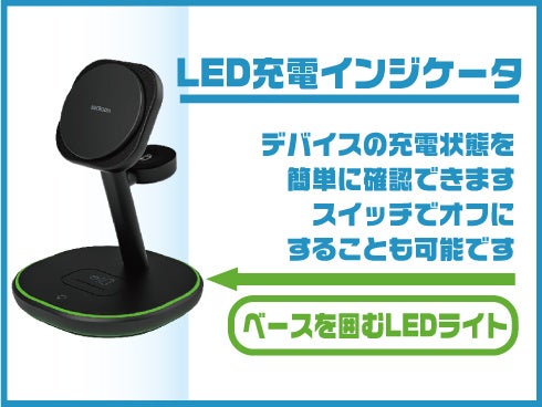 ベースを囲むLEDライトがデバイスの充電状況を直感的に表示。AirPods充電パッド横のスイッチでオンオフも切り替え可能なので、寝室でも安心して使えます。