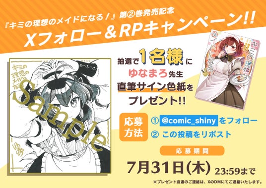 キルタイムコミュニケーション(東京都中央区)は、シャイニーコミックス『キミの理想のメイドになる!2』を7月14日に発売いたしました。発売を記念して【直筆サイングッズプレゼントキャンペーン】や【Xフォロー&RPキャンペーン】を開催しております。