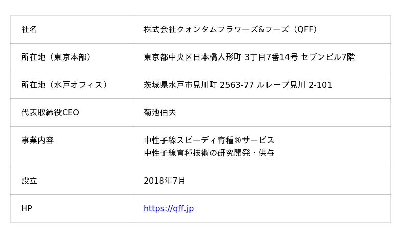 量子バイオテクノロジーを活用した超高速品種改良サービス「中性子線スピーディ育種(R)」を提供する 株式会社クォンタムフラワーズ&フーズ(本社:東京都中央区日本橋人形町 3丁目7番14号、代表取締役CEO:菊池 伯夫、以下「QFF」)は、三菱UFJ銀行が主催する 「MUFG Startup Summit 2025 in NAGOYA」(開催日:2025年7月17日、会場:STATION Ai)へ出展することをお知らせいたします。 当日は、世界で初めて(※1)社会実装に成功した育種技術「中性子線スピーディ育種(R)」の実績を詳しくご紹介し、耐暑性・高栄養・高機能作物や発酵微生物などの新系統開発をご検討中のお客様との商談機会を創出します。