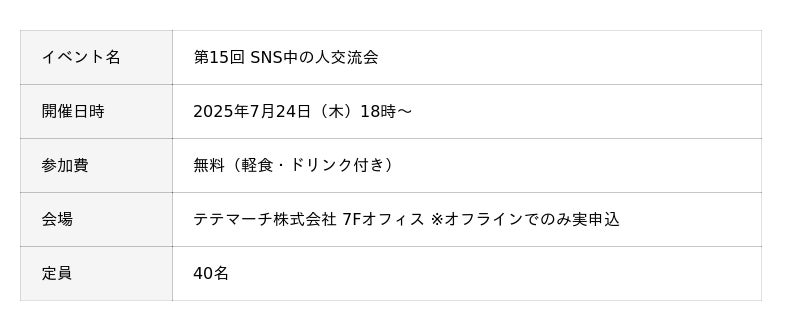 テテマーチ株式会社(本社:東京都目黒区、代表取締役:上田 大介)は、企業のSNS運用担当者向けの人気イベント「SNS中の人交流会」の第15回開催を決定いたしました。